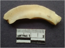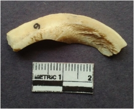 | Description / विवरण | Fragment of shell circlet with squarish section and striations. |