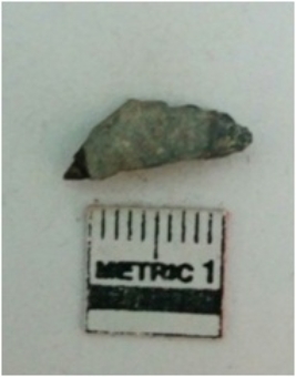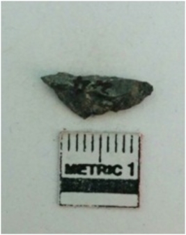 | Description / विवरण | The dark schist piece has flake scars on the surface and sharp edges as a result of flaking. |