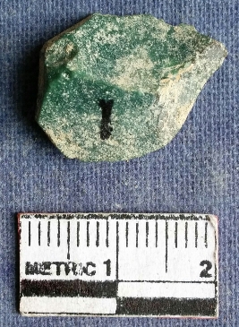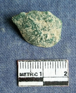 | Description / विवरण | Chert stone flake, greenish in color, on one side flake ridges and the other side is with bulb of percussion and rough surfaces. |