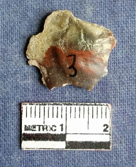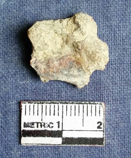 | Description / विवरण | A thin flake of chert with surfacial deposition on one side. |