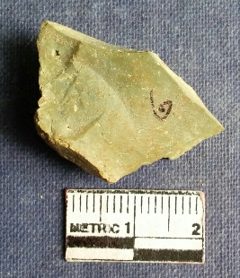 | Description / विवरण | This is a utilized chert flake with sharp edges on one side, one side multiple ripples lines are seen, flaked ridges. |