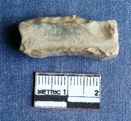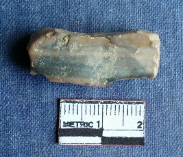 | Description / विवरण | This is a lithic waste of chert stone, this piece is in rectangular in shape, retouched on one side with denticulated marks. |