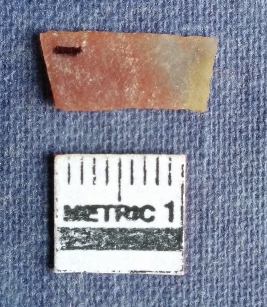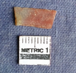 | Description / विवरण | This is a jasper blade fragment, flaked and flat in shape, smooth on the vendral side and there are ridges margins on the dorsal side. Broken ends with trapizium cross section of fine blade fragment. |