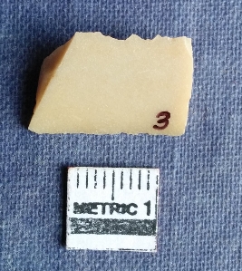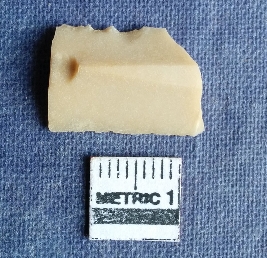 | Description / विवरण | This is a fine smooth chert blade fragment with both ends broken. Trapizium cross section with sharp margins and one side margin shows denticulated marks. Creamish in color. |
