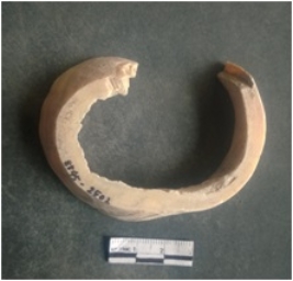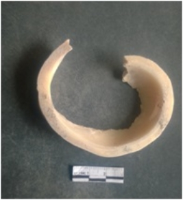 | Description / विवरण | This is a shell circlet fragment with two broken ends. Unfinished and unpolished with cut edges. Possibly either it is a raw material or waste product in the manufacturing unit. |
