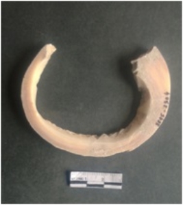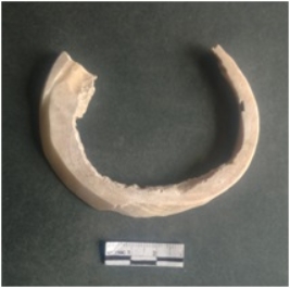 | Description / विवरण | This is a shell circlet fragment with two broken ends. Unfinished and unpolished with cut edges. Possibly either it is a raw material or waste product in the manufacturing unit. |