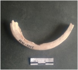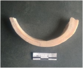 | Description / विवरण | This is a shell circlet fragment with two broken ends. Unfinished and unpolished with cut edges. Possibly either it is a raw material or waste product in the manufacturing unit. |