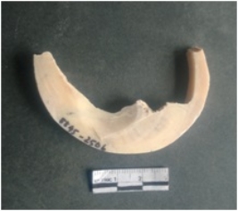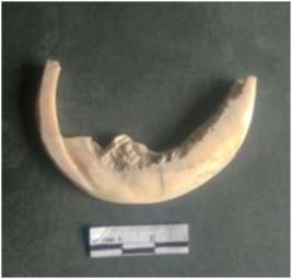 | Description / विवरण | This is a shell circlet fragment with two broken ends. Unfinished and unpolished with cut edges. Possibly either it is a raw material or waste product in the manufacturing unit. |