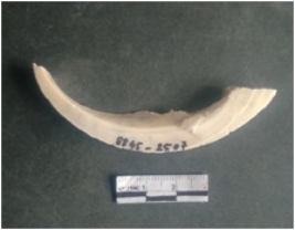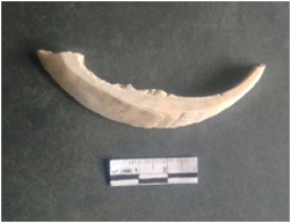 | Description / विवरण | This is a shell circlet fragment with two broken ends. Unfinished and unpolished with cut edges. Possibly either it is a raw material or waste product in the manufacturing unit. |