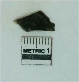 | Description / विवरण | The dark schist piece has flake scars on the surface and sharp edges as a result of flaking. |