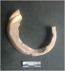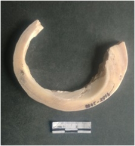 | Description / विवरण | This is a shell circlet fragment with two broken ends. Unfinished and unpolished with cut edges. Possibly either it is a raw material or waste product in the manufacturing unit. |