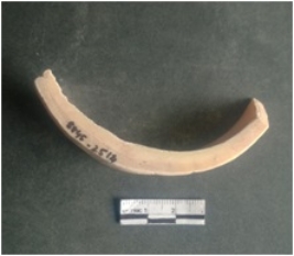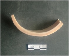 | Description / विवरण | This is a shell circlet fragment with two broken ends. Unfinished and unpolished with cut edges. Possibly either it is a raw material or waste product in the manufacturing unit. |