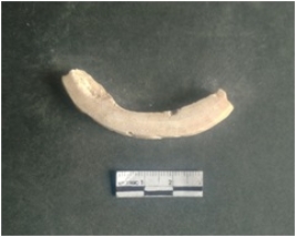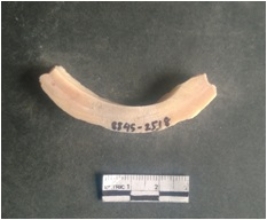 | Description / विवरण | This is a shell circlet fragment with two broken ends. Unfinished and unpolished with cut edges. Possibly either it is a raw material or waste product in the manufacturing unit. |