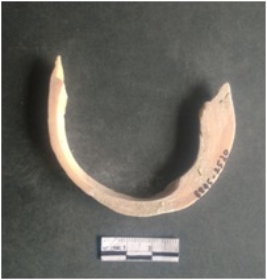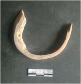 | Description / विवरण | This is a shell circlet fragment with two broken ends. Unfinished and unpolished with cut edges. Possibly either it is a raw material or waste product in the manufacturing unit. |