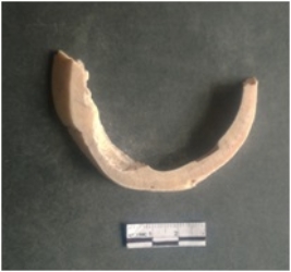 | Description / विवरण | This is a shell circlet fragment with two broken ends. Unfinished and unpolished with cut edges. Possibly either it is a raw material or waste product in the manufacturing unit. |