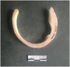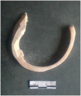 | Description / विवरण | This is a shell circlet fragment with two broken ends. Unfinished and unpolished with cut edges. Possibly either it is a raw material or waste product in the manufacturing unit. |