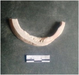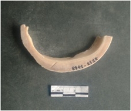 | Description / विवरण | This is a shell circlet fragment with two broken ends. Unfinished and unpolished with cut edges. Possibly either it is a raw material or waste product in the manufacturing unit. |