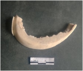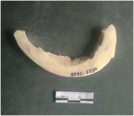 | Description / विवरण | This is a shell circlet fragment with two broken ends. Unfinished and unpolished with cut edges. Possibly either it is a raw material or waste product in the manufacturing unit. |
