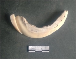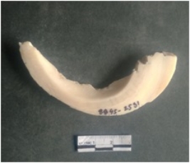 | Description / विवरण | This is a shell circlet fragment with two broken ends. Unfinished and unpolished with cut edges. Possibly either it is a raw material or waste product in the manufacturing unit. |