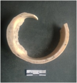 | Description / विवरण | This is a shell circlet fragment with two broken ends. Unfinished and unpolished with cut edges. Possibly either it is a raw material or waste product in the manufacturing unit. |