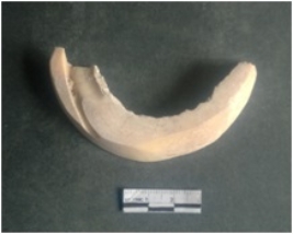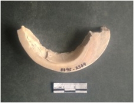 | Description / विवरण | This is a shell circlet fragment with two broken ends. Unfinished and unpolished with cut edges. Possibly either it is a raw material or waste product in the manufacturing unit. |