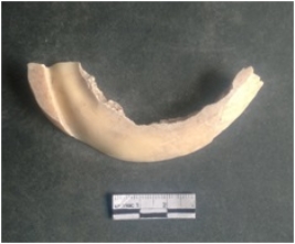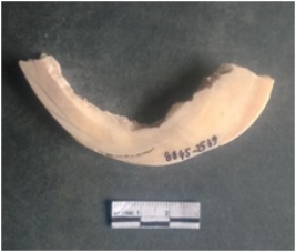 | Description / विवरण | This is a shell circlet fragment with two broken ends. Unfinished and unpolished with cut edges. Possibly either it is a raw material or waste product in the manufacturing unit. |
