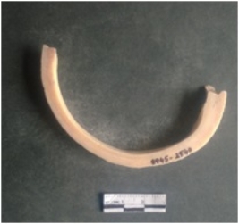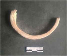 | Description / विवरण | This is a shell circlet fragment with two broken ends. Unfinished and unpolished with cut edges. Possibly either it is a raw material or waste product in the manufacturing unit. |
