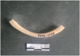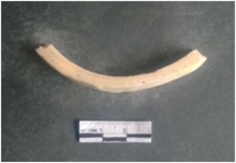 | Description / विवरण | This is a shell circlet fragment with two broken ends. Unfinished and unpolished with cut edges. Possibly either it is a raw material or waste product in the manufacturing unit. |