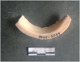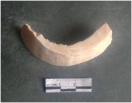 | Description / विवरण | This is a shell circlet fragment with two broken ends. Unfinished and unpolished with cut edges. Possibly either it is a raw material or waste product in the manufacturing unit. |