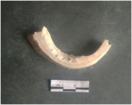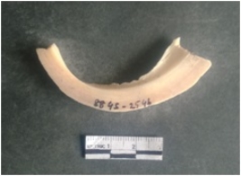| Description / विवरण | This is a shell circlet fragment with two broken ends. Unfinished and unpolished with cut edges. Possibly either it is a raw material or waste product in the manufacturing unit. |