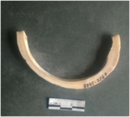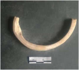 | Description / विवरण | This is a shell circlet fragment with two broken ends. Unfinished and unpolished with cut edges. Possibly either it is a raw material or waste product in the manufacturing unit. |