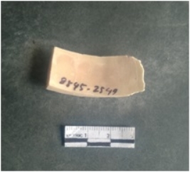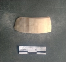 | Description / विवरण | This is a shell circlet fragment with two broken ends. Unfinished and unpolished with cut edges. Possibly either it is a raw material or waste product in the manufacturing unit. |