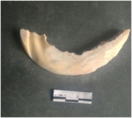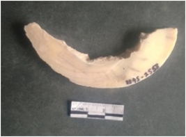 | Description / विवरण | This is a shell circlet fragment with two broken ends. Unfinished and unpolished with cut edges. Possibly either it is a raw material or waste product in the manufacturing unit. |