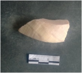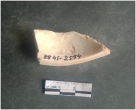 | Description / विवरण | This is a shell circlet fragment with two broken ends. Unfinished and unpolished with cut edges. Possibly either it is a raw material or waste product in the manufacturing unit. |