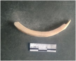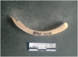 | Description / विवरण | This is a shell circlet fragment with two broken ends. Unfinished and unpolished with cut edges. Possibly either it is a raw material or waste product in the manufacturing unit. |