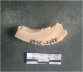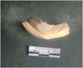 | Description / विवरण | This is a shell circlet fragment with two broken ends. Unfinished and unpolished with cut edges. Possibly either it is a raw material or waste product in the manufacturing unit. |