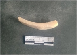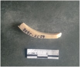 | Description / विवरण | This is a shell circlet fragment with two broken ends. Unfinished and unpolished with cut edges. Possibly either it is a raw material or waste product in the manufacturing unit. |