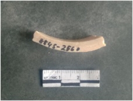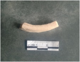 | Description / विवरण | This is a shell circlet fragment with two broken ends. Unfinished and unpolished with cut edges. Possibly either it is a raw material or waste product in the manufacturing unit. |
