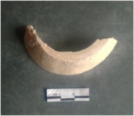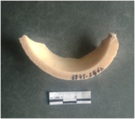 | Description / विवरण | This is a shell circlet fragment with two broken ends. Unfinished and unpolished with cut edges. Possibly either it is a raw material or waste product in the manufacturing unit. |