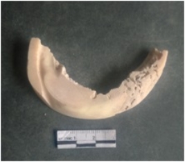 | Description / विवरण | This is a shell circlet fragment with two broken ends. Unfinished and unpolished with cut edges. Possibly either it is a raw material or waste product in the manufacturing unit. |