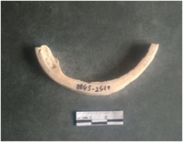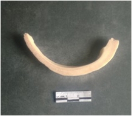 | Description / विवरण | This is a shell circlet fragment with two broken ends. Unfinished and unpolished with cut edges. Possibly either it is a raw material or waste product in the manufacturing unit. |