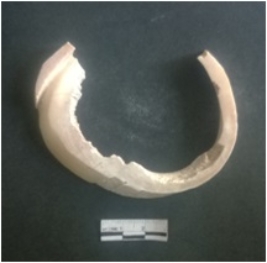 | Description / विवरण | This is a shell circlet fragment with two broken ends. Unfinished and unpolished with cut edges. Possibly either it is a raw material or waste product in the manufacturing unit. |