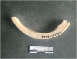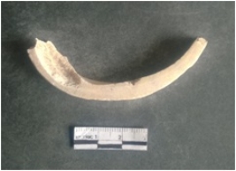 | Description / विवरण | This is a shell circlet fragment with two broken ends. Unfinished and unpolished with cut edges. Possibly either it is a raw material or waste product in the manufacturing unit. |