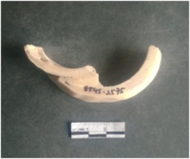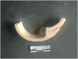 | Description / विवरण | This is a shell circlet fragment with two broken ends. Unfinished and unpolished with cut edges. Possibly either it is a raw material or waste product in the manufacturing unit. |