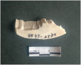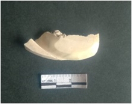 | Description / विवरण | This is a shell circlet fragment with two broken ends. Unfinished and unpolished with cut edges. Possibly either it is a raw material or waste product in the manufacturing unit. |