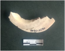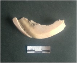 | Description / विवरण | This is a shell circlet fragment with two broken ends. Unfinished and unpolished with cut edges. Possibly either it is a raw material or waste product in the manufacturing unit. |
