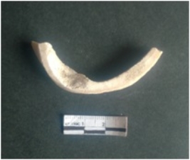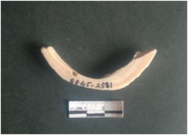 | Description / विवरण | This is a shell circlet fragment with two broken ends. Unfinished and unpolished with cut edges. Possibly either it is a raw material or waste product in the manufacturing unit. |