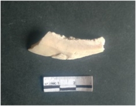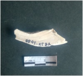 | Description / विवरण | This is a shell circlet fragment with two broken ends. Unfinished and unpolished with cut edges. Possibly either it is a raw material or waste product in the manufacturing unit. |