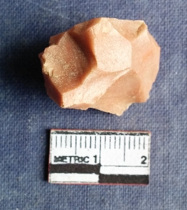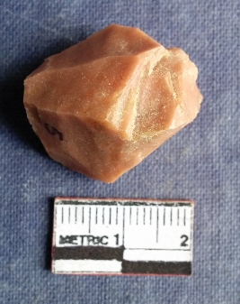 | Description / विवरण | This is a fragment of chert flaked removed from all sides with cut ridges, pink in color. |