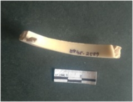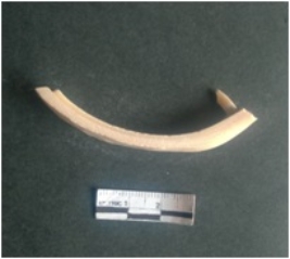 | Description / विवरण | This is a shell circlet fragment with two broken ends. Unfinished and unpolished with cut edges. Possibly either it is a raw material or waste product in the manufacturing unit. |